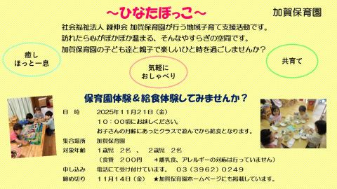 日時:2025年11月21日(金) 10:00頃に加賀保育園へお越しください。